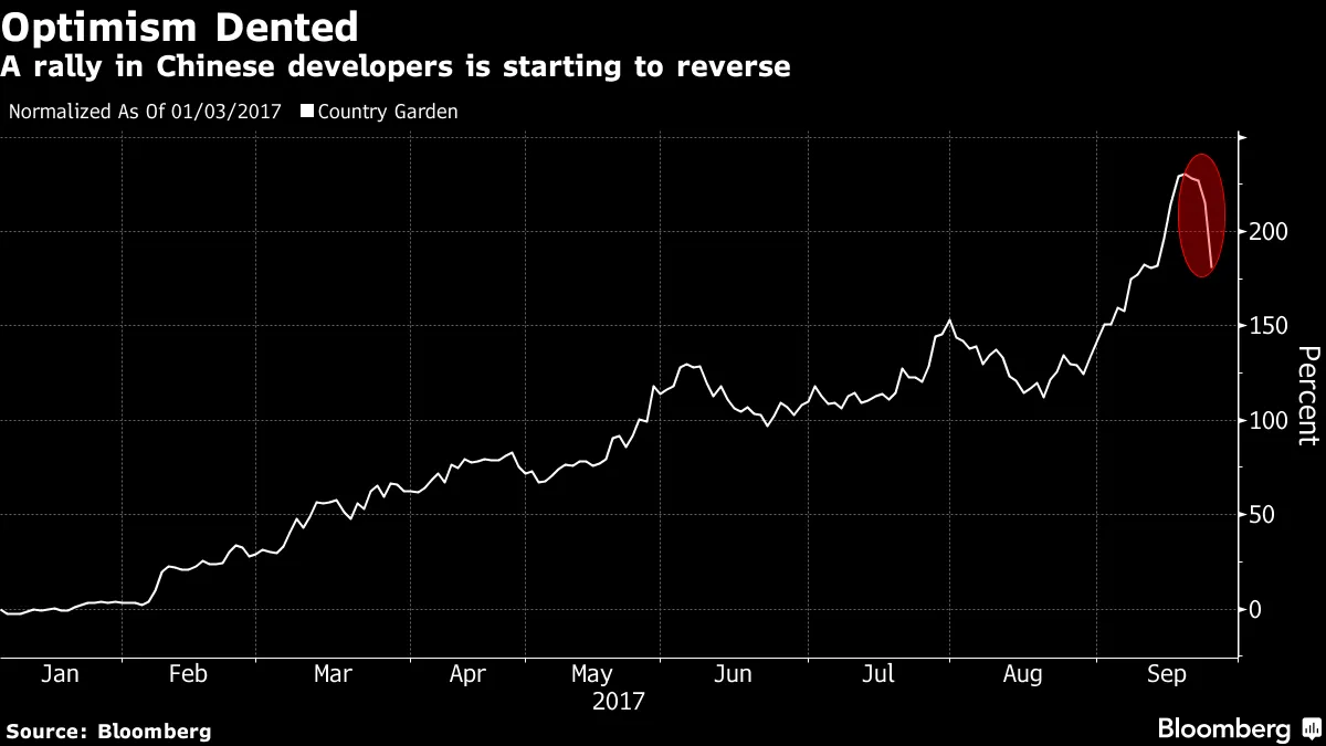 不要忘记中国中国房地产股票在香港暴跌,此前一系列内地城市新增住房限制,令押注政府下一步将放宽限制的投资者感到意外,彭博社报道。包括重庆和南宁在内的八个城市在周末推出了限制措施,大多数城市禁止在购房后两到三年内转售,官方新华社报道。总部位于上海的Tospur房地产咨询公司表示,可能还有六个城市会效仿,但未透露具体名称。彭博情报的22家开发商指数周一暴跌9.1%,是六年来最大跌幅,这使得一些股票市场明星如中国恒大集团和融创中国的估值受到影响,今年它们的股价分别上涨了五倍和四倍。在即将于10月18日开始的每两年一次的共产党大会之前,房地产行业成为政策制定者的关注焦点,领导人试图在不让经济崩溃的情况下冷却价格。
