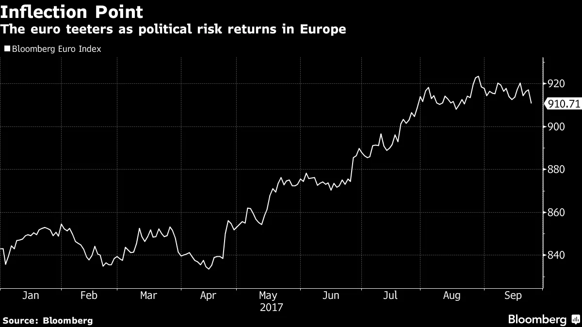 现在或永远是欧元的时刻政治风险再次影响欧元。彭博欧元指数在德国选举显示民粹主义右翼的德国选择党获得比预期更多的权力后,跌幅为自三月以来最大,这使得默克尔总理领导的基督教民主联盟受到影响。在四月中旬到七月底之间,随着政治风险缓解和欧元区经济增强,彭博欧元指数曾上涨多达9.8%。自八月初以来,该指数基本保持不变。这让许多策略师开始怀疑欧元是否已经变得过于昂贵,下一步是否会下跌。然而,如果该货币能够维持在这些水平,空头可能会感到失望。“现在或永远是欧元修正的时刻,”总部位于伦敦的法兴银行策略师基特·贾克斯在周一的一份研究报告中写道。贾克斯补充说,他正在密切关注欧元对瑞典克朗、挪威克朗和波兰兹罗提的走势,以寻找该货币下一步的线索。