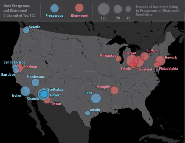 尽管对所有邮政编码的分析显示,困扰程度最高的地区集中在南方,但前10个大型困扰大都市城市则聚集在东北和中西部:克利夫兰、纽瓦克、布法罗、底特律和托莱多位列前五。最繁荣的大型城市则位于海岸的另一侧——德克萨斯州(普莱诺和奥斯汀)、加利福尼亚州(尔湾、旧金山和圣荷西)以及亚利桑那州(吉尔伯特、钱德勒和斯科茨代尔)的西部和太平洋西北部科技中心。