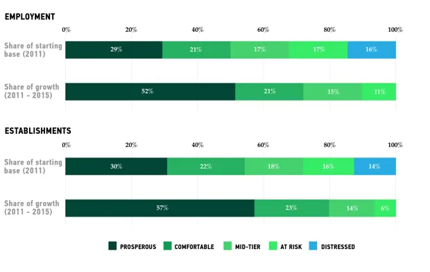 在2008年大萧条之后,整个国家在2011年至2015年间经历了经济复苏,但这份报告显示,已经脆弱的社区错过了大部分增长。城市就业实际上自2011年以来平均下降了6%,而在最困扰的社区,企业的建立平均下降了6.3%。与此同时,就业和商业发展的增长超过一半集中在繁荣的社区。