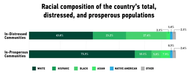 与白人和亚裔人口相比,黑人、西班牙裔和美洲原住民在困境社区中的比例过高,而在繁荣社区中的比例则过低。