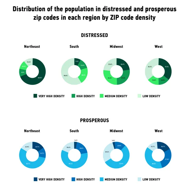 在东北部,DCI发现困扰主要集中在城市地区,而在南部,同样高的经济萧条率则集中在农村地区。与此同时,中等密度地区——与郊区最相关的住房模式——在全国范围内蓬勃发展,许多地区是全国最繁荣的地区。报告没有明确指出的是,并非所有中等密度地区都是郊区性质的,并非所有郊区都是繁荣的:随着一些郊区的人口组成变化,距离中心大都市区的距离变得更远,而联邦和州的投资则流向“内城区”,以牺牲外缘地区为代价,这些社区也可能经历困扰。