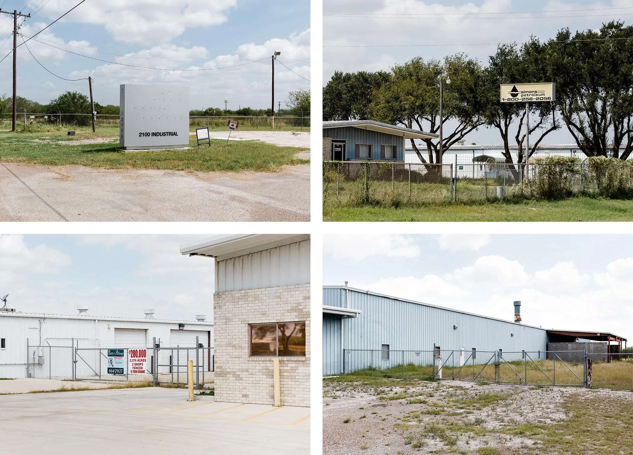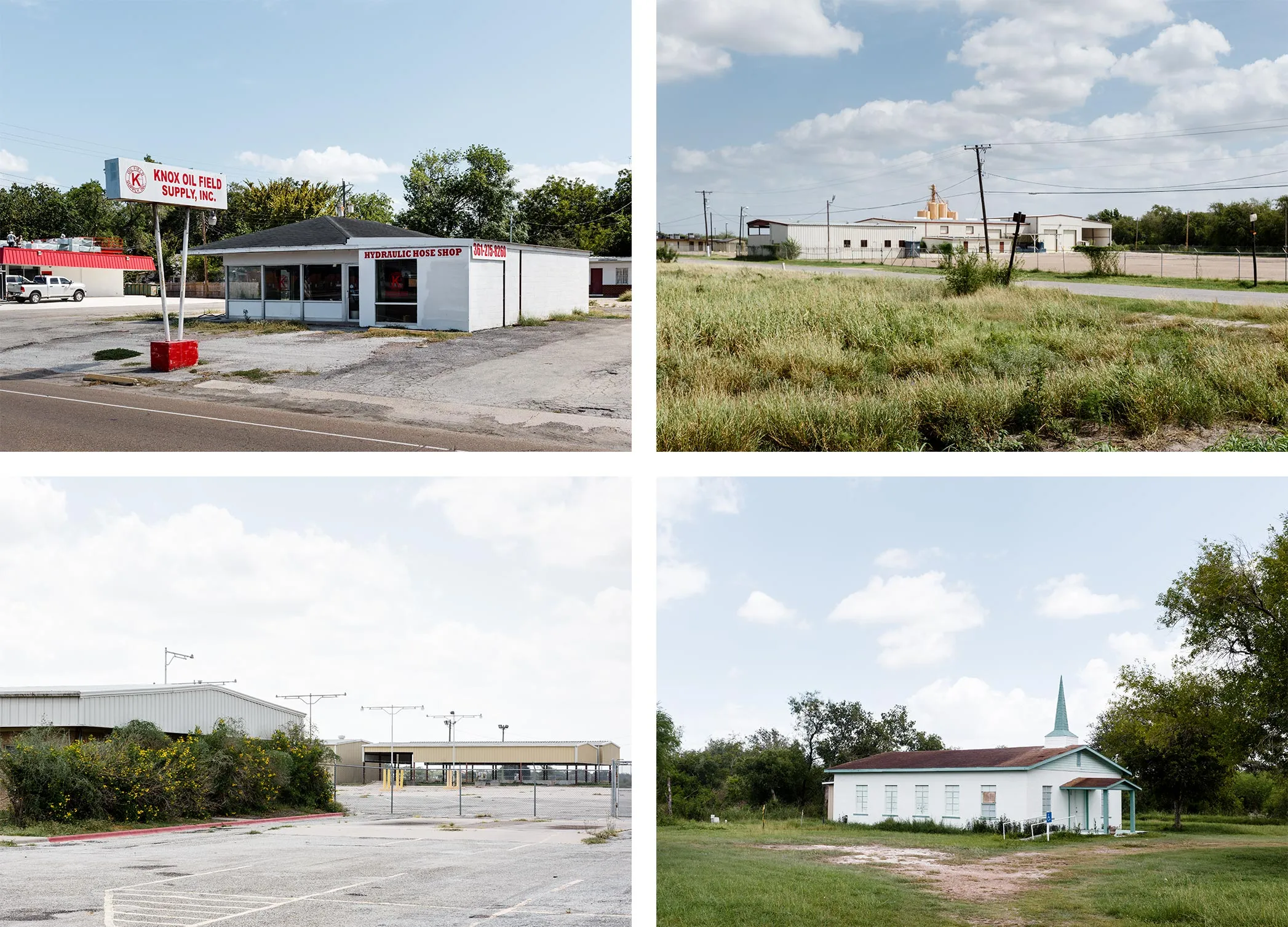 从左上角顺时针:德克萨斯州库埃罗的一家空置的石油供应商店;德克萨斯州爱丽丝的两处空置商业物业;以及从爱丽丝到库埃罗的路上的一座废弃教堂。摄影师:Max Burkhalter 为彭博社拍摄他花了很多时间在皮卡上,驾驶穿越鹰福德地区的高速公路和乡村道路。最近的一次旅行带他向南,穿过爱丽丝镇周围的工业走廊,揭示了经济崩溃留下的伤痕。曾经容纳办公室和仓库以支持疯狂钻探活动的巨大波纹金属结构现在空无一人。侧面的褪色油漆上写着 Drilco、Genco 和 Forum Energy Technologies 等公司的名字。曾经满是卡车和设备的停车场现在杂草丛生。