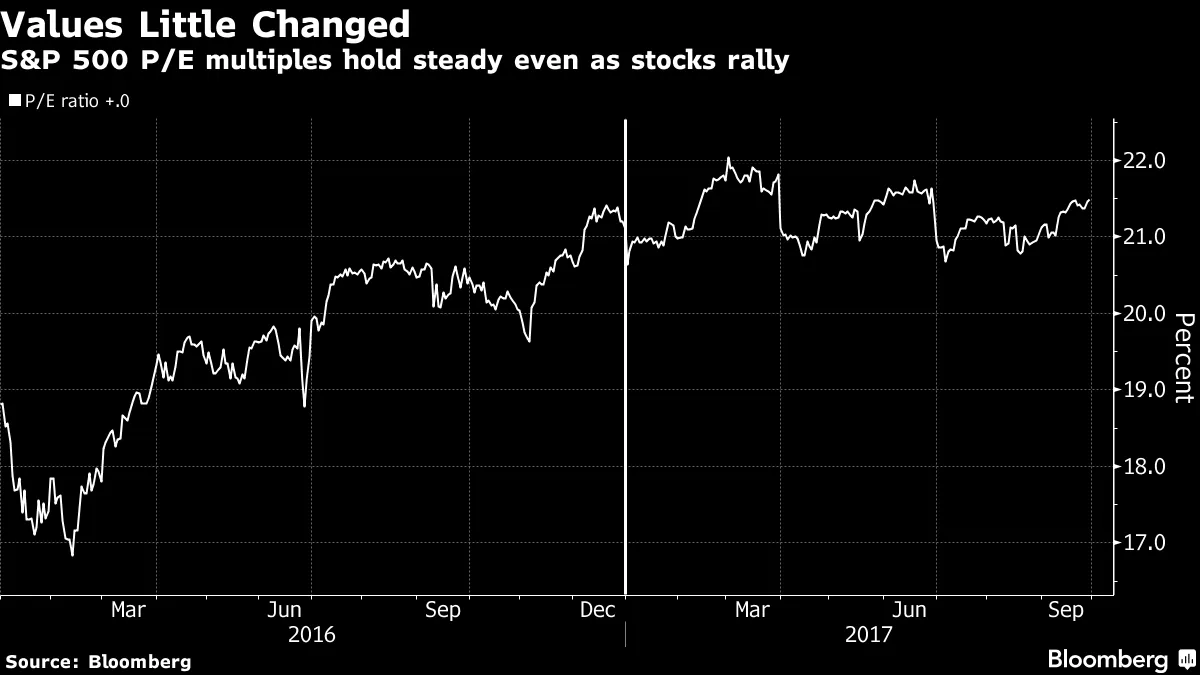 根据FTN金融经济学家Chris Low的说法,下降始于9月8日,当时中国报告的通胀数据高于预期,导致许多人担心所谓的全球再通胀交易即将回归。然后,就在交易员将12月美联储加息的概率降低到微不足道的20%时,中央银行官员开始更加鹰派地发言。接着是哈维和厄玛飓风,这导致汽油价格上涨,将使未来几个月的头条通胀数据保持在高位。最后,本周,特朗普政府发布了更多的减税计划细节,引发了担忧政府将需要出售更多债券以弥补任何收入损失,正当美联储开始减少对到期债券收益的再投资。股票上涨,估值却没有在8月的波动之后,全球股票重新回到正轨,MSCI全球指数有望显示连续第六个季度的增长。自6月底以来,该指数上涨了4.23%,今年上涨了14.9%。一些全球最大的银行表示,股票最终可能会回调——也许——但不会很快。巴克莱刚刚发布了其第四季度展望,并表示没有看到可能会扰乱风险资产估值的合理催化剂。例如,在美国,标准普尔500指数今年上涨了12%,但由于企业利润上升,市盈率保持在约21的水平。高盛表示,考虑到商业扩张的晚期、美国财政刺激预期的上升以及持续强劲的宏观数据,没有理由相信股票和其他风险资产不会继续表现良好,尤其是周期性股票、金融股和小型股。
