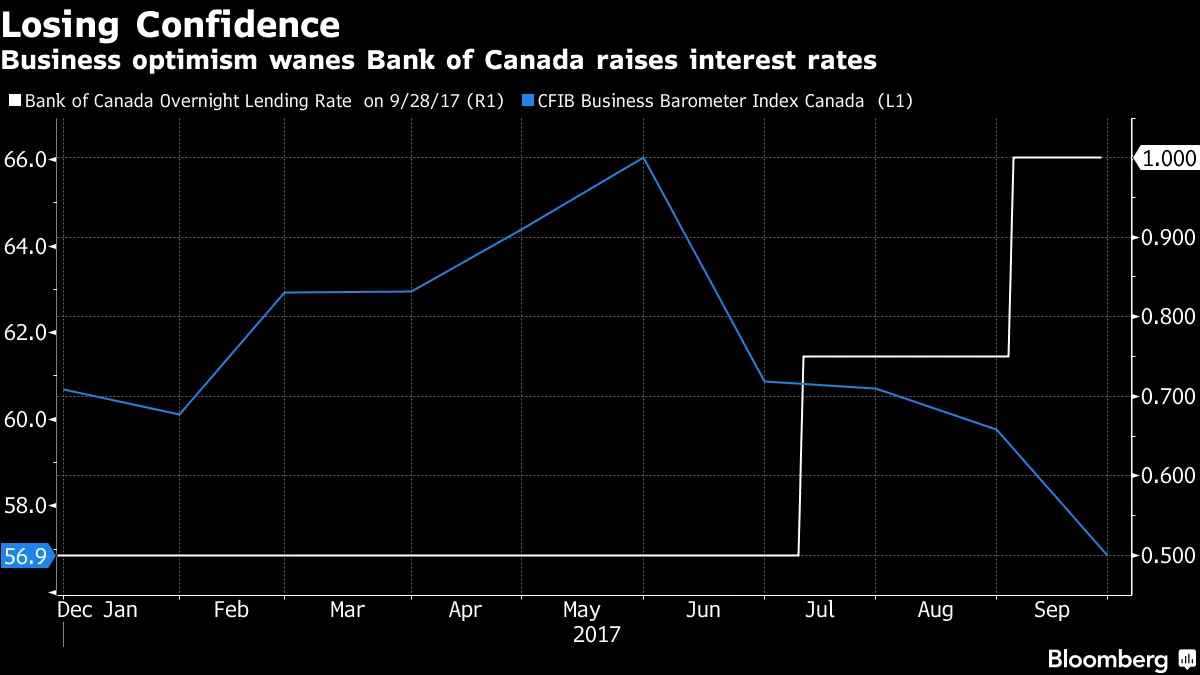 加拿大的困境加拿大央行官员在本季度两次加息后可能需要重新考虑他们的鹰派立场。这是因为周四发布的一项调查显示 中小企业的乐观情绪正在下降。加拿大独立商业联合会发现,商业信心连续第四个月下降,达到自2016年3月以来的最低水平,此前在5月达到峰值。加拿大商会在今夏对商业信心发出了类似的警告。来自加拿大商业委员会的另一项调查发现,首席执行官们担心国家已成为一个更糟糕的商业环境,面临繁重的法规和不断上升的劳动力和能源成本。根据彭博新闻的乔什·温格罗夫和埃里克·赫茨伯格的报道,这些报告突显了加拿大企业中存在的一种担忧,即使它们受益于过去十年中最强劲的增长期。这些担忧受到从美国日益增长的保护主义到税收和监管成本上升的各种因素的驱动,包括新的碳定价和更高的最低工资。