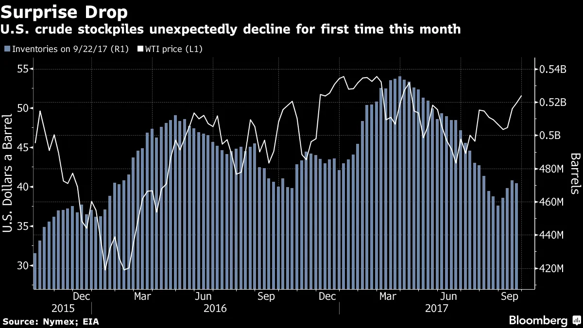 这迟早会发生也许世界上没有哪个市场比石油市场更可预测。每当原油价格超过50美元一桶时,美国页岩钻探者就会增加产量以利用这一上涨。然后,随着供应增加,价格下跌。我们可能正在看到这一趋势再次开始,此前油价从46美元上涨到超过52美元,随后在周四回落至接近51美元。美国政府周三发布的数据表明,美国钻探者在过去三周内将产量提高了近9%,这是过去五年来最大的三周增幅,彭博新闻的米纳尔·万布尔卡(Meenal Vamburkar)和杰西卡·萨默斯(Jessica Summers)报道。美国探险者的热情可能会抵消OPEC及其盟友如俄罗斯的供应限制。“如果我们看到美国生产水平上升的迹象,市场现在真的很脆弱,随时可能出现反转,”Tradition Energy的市场研究经理基因·麦基利安(Gene McGillian)说。自6月底以来,油价已上涨超过20%,这符合牛市的经典定义,因需求改善的预测、哈维飓风后美国墨西哥湾沿岸炼油厂的复工,以及土耳其威胁停止通过其领土运输库尔德原油。