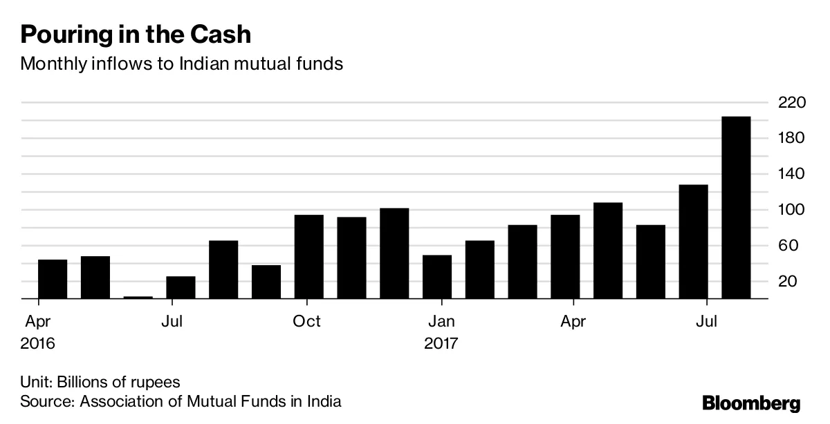 聚会在印度刚刚开始全球股市的上升潮并没有提升所有的船只。新兴市场正处于一个恶劣的下行趋势,MSCI新兴市场指数连续第六天下跌,使本月的损失达到1.36%。九月是基准指数自十一月以来最糟糕的月份。但至少根据摩根士丹利的说法,不要因小失大。该公司正在全力投入印度股票,表示最近流入本地股票基金的资金潮只是个开始,因为国家的储户在对黄金、房地产和固定收益的需求减弱时追逐股票回报,彭博新闻的阿梅亚·卡尔维(Ameya Karve)报道。“聚会刚刚开始,”摩根士丹利印度的董事总经理瑞达姆·德赛(Ridham Desai)说。当地股票基金的流入在八月份达到了创纪录的2040亿印度卢比(31亿美元)。这股流动性为因亚洲风险规避情绪引发的资金外流提供了缓冲。摩根士丹利预计,基准敏感指数成分股的收益将在截至2018年3月的年度增长11%,在接下来的财年增长19%。它预计未来十年经济年均增长7.1%。