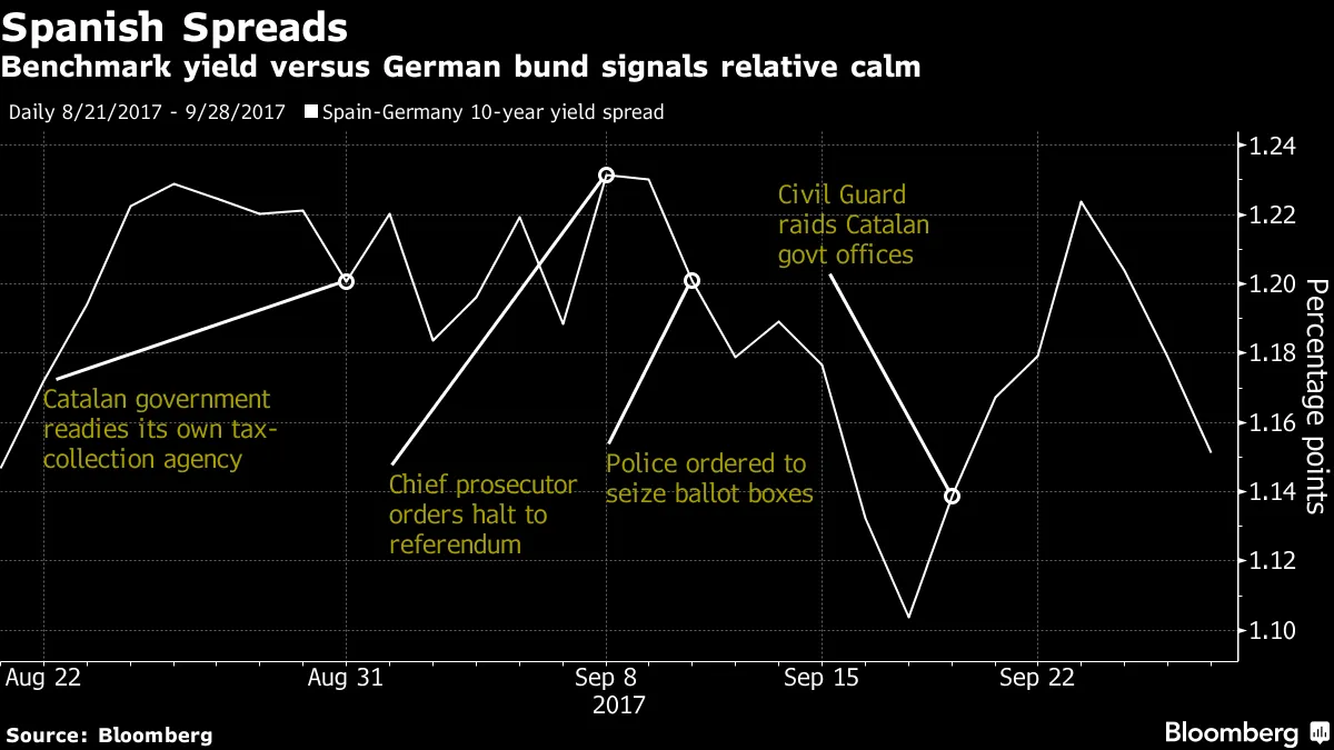 到目前为止,投资者对这一已成为西班牙自四十年前独裁者弗朗西斯科·弗朗哥去世后重返民主以来最严重的宪法危机的反应冷淡。西班牙的基准IBEX 35指数今年表现优于同行,而投资者要求持有西班牙债券而非德国债务的额外收益率与去年九月相比几乎没有变化。
