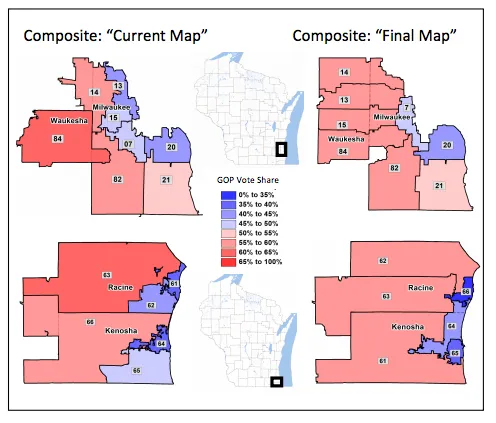 左侧的地图显示了2002年至2010年间密尔沃基的选区。右侧的地图显示了2012年以后的选区。划分从西南密尔沃基的4R/4D转变为通过打破密尔沃基县西侧的民主党人而变为6R/2D,从2R/4D转变为拉辛和基诺沙的3R/3D。竞选法律中心乔维·陈,密歇根大学的助理教授,已经在利用技术帮助法院导航判决过程。通过使用算法,陈将一个州的重新划分标准输入,并生成数千个替代地图,以查看是否可以绘制出比州立法机构创建的地区更少党派化的选区。例如,在威斯康星州的案例中,陈的地图显示,议会的地图并没有尽可能紧凑,他表示,“发现做得更好是更容易的。”