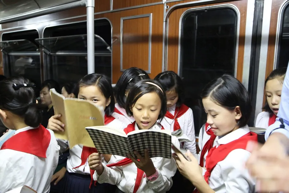 NK新闻穿着共青团围巾的女学生在平壤地铁上学习。地铁系统埋在地下超过350英尺,并且还充当核掩体。
