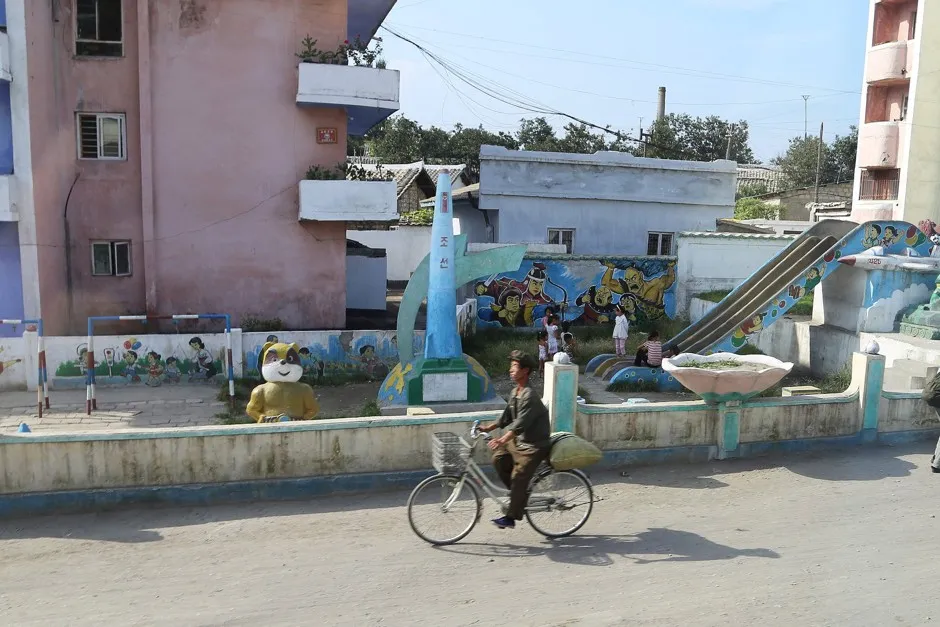 NK新闻朝鲜东海岸的一个游乐场包括滑梯、秋千(缺少秋千)和一枚火箭,还有一幅卡通战斗壁画。激进的叙事和反美宣传是朝鲜教育的重要组成部分。