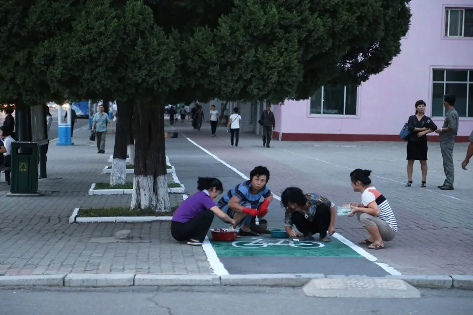 NK新闻平壤开始在2015年引入全市的自行车道,通过在与行人共享的人行道上划定自行车道。就像北朝鲜的许多事情一样,街道标记的绘制工作是手工完成的。