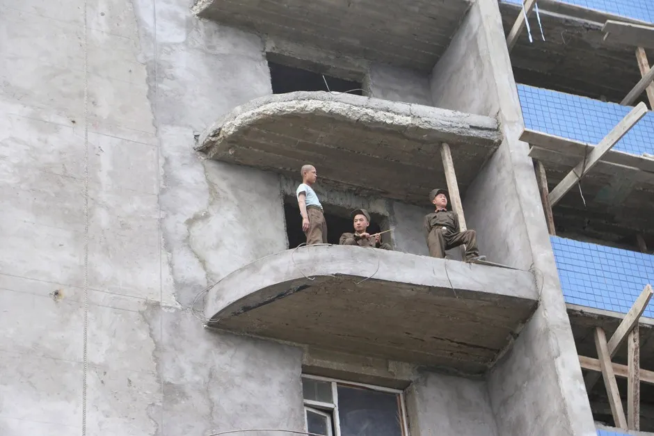 NK新闻三名年轻的士兵劳动者站在平壤一栋新公寓未完成的阳台上。朝鲜的建筑通常质量低劣,依赖过时的建筑技术和强化不足的混凝土。