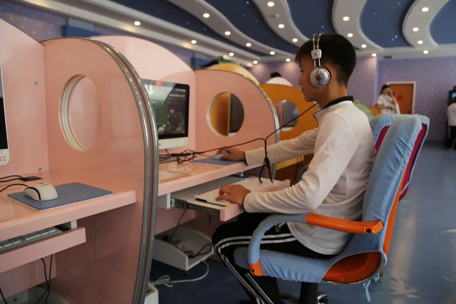 NK新闻一个男孩在日本海的港口城市元山的游戏室里玩射击游戏。第一人称射击游戏在朝鲜很受欢迎,包括反美游戏“猎杀洋基”。