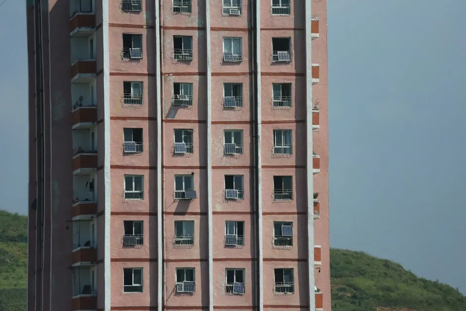 NK新闻北朝鲜南部开城外的一栋建筑的居民在窗外悬挂太阳能电池板,以帮助应对偶发的停电。北朝鲜的能源基础设施自1990年代以来一直在衰退,当时苏联的崩溃限制了燃料供应。