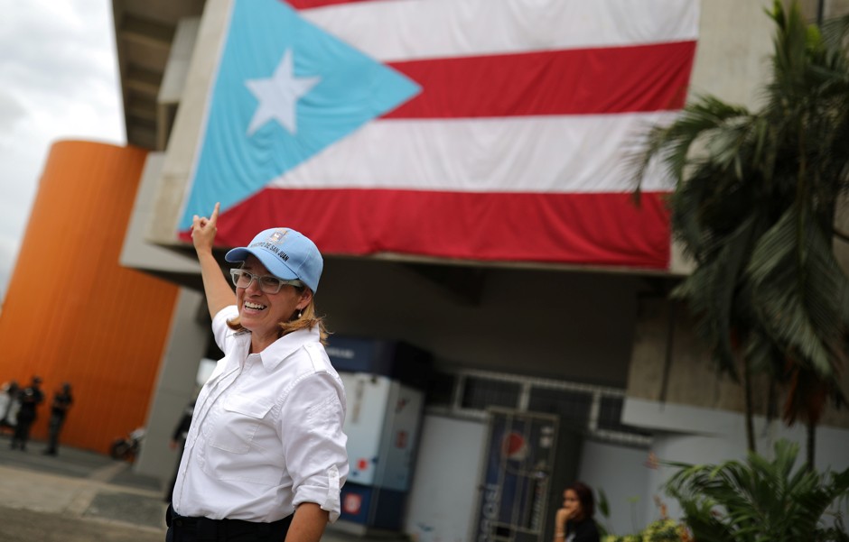 圣胡安市市长卡门·尤林·克鲁兹在玛丽亚飓风过后几天,在罗伯托·克莱门特体育馆的政府中心外指着一面波多黎各国旗。卡洛斯·巴里亚/路透社**波多黎各的声音:**在唐纳德·特朗普总统的批评声中,圣胡安市市长卡门·尤林·克鲁兹成为波多黎各在伊尔玛和玛丽亚飓风后挑战的最显著发言人,确立了自己作为一位“毫不含糊的领导者,具备同理心的才能。”卫报报道: