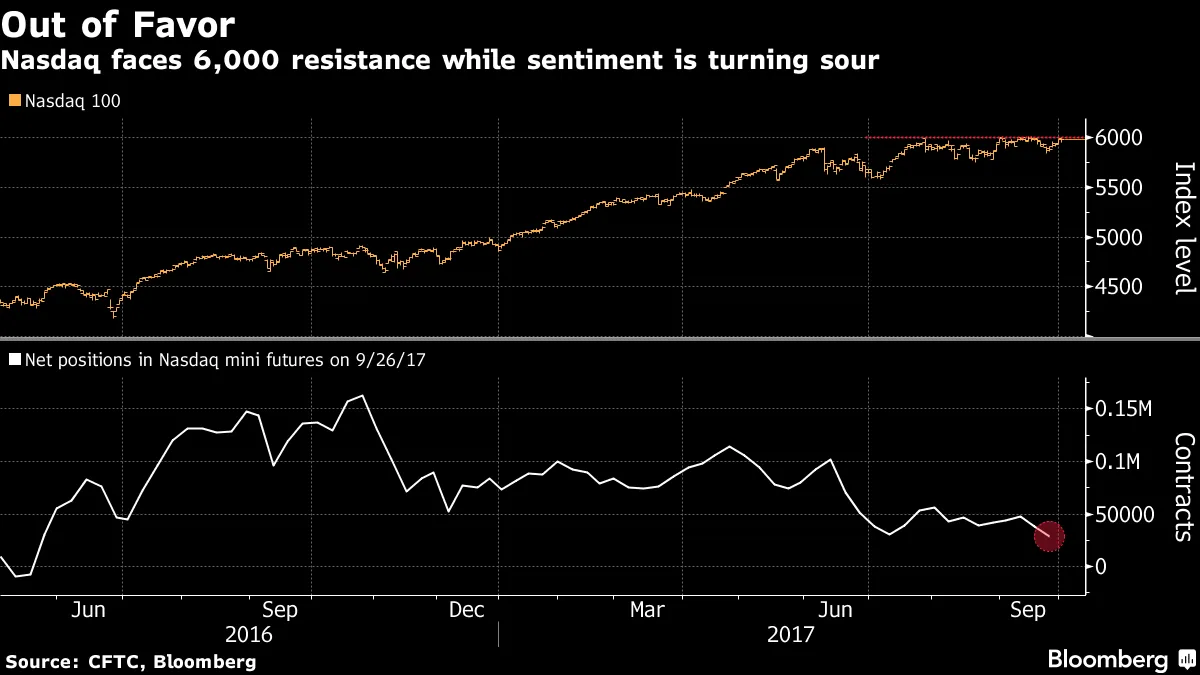 彭博社商业周刊谁认为中国不是经济强国?中国2024年印刷杂志复兴家得宝的12英尺骷髅催生了一个巨型万圣节装饰产业加州的新经济正在缓慢扎根于木材行业科技股正在挣扎主要的美国股票指数本周再次达到了新高,但市场的一个非常重要部分正在发出非常令人不安的信号。以苹果、亚马逊和脸书等公司为主的纳斯达克100指数在周一第六次突破6000点,但再次未能维持。它仅在9月13日那天超过过这一水平。商品期货交易委员会的数据表明,大型投机者上周将其在跟踪该指数的迷你期货中的净多头头寸减少到自2016年5月以来的最低水平。交易所交易基金的投资者在过去五天内从科技相关基金中撤回了近9亿美元,超过了彭博社跟踪的任何其他行业。这很重要,因为这表明科技股可能正在将整体市场的领导权让给银行和能源股,彭博社新闻的卢旺表示。这一轮换是由更高的债券收益率、稳定的美元和唐纳德·特朗普总统的税收计划发布所推动的。纳斯达克100指数在2017年表现良好,在1月6日突破5000点,至8月时实现了23.1%的涨幅。从那时起,它一直保持平稳。