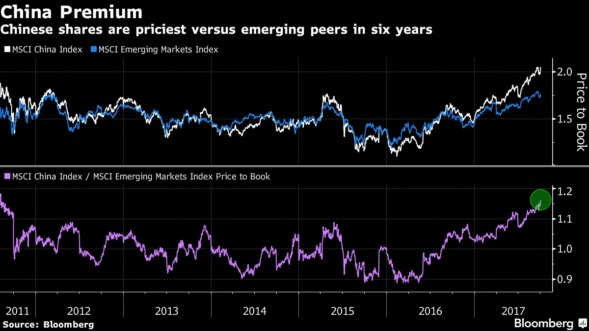 中国股票正在振动中国的股票以其大幅波动而闻名,但即使是最冷漠的观察者也不得不注意周二发生的事情。中国的离岸股票在新季度开始时迎来了自2016年4月以来最大的反弹,MSCI中国指数在香港市场假期后重新开放时上涨了多达2.4%。一个更窄的中国H股指数飙升了3.9%。根据彭博新闻的理查德·弗罗斯特和艾玛·戴的说法,政策放松和强劲的工厂数据的结合对投资者来说是一个强有力的组合。如果说有什么的话,这些收益突显了这一年对国家股票的巨大影响,至少对于在香港和美国交易的股票而言,在过去十年回报不佳之后。今年MSCI中国指数上涨了45%之前,该基准自2009年底以来下跌了10%。来自中国、香港和台湾的公司在今年的MSCI新兴市场指数中占据了前15名表现者,而中国股票相对于其发展中国家同行而言,自2011年以来是最昂贵的。