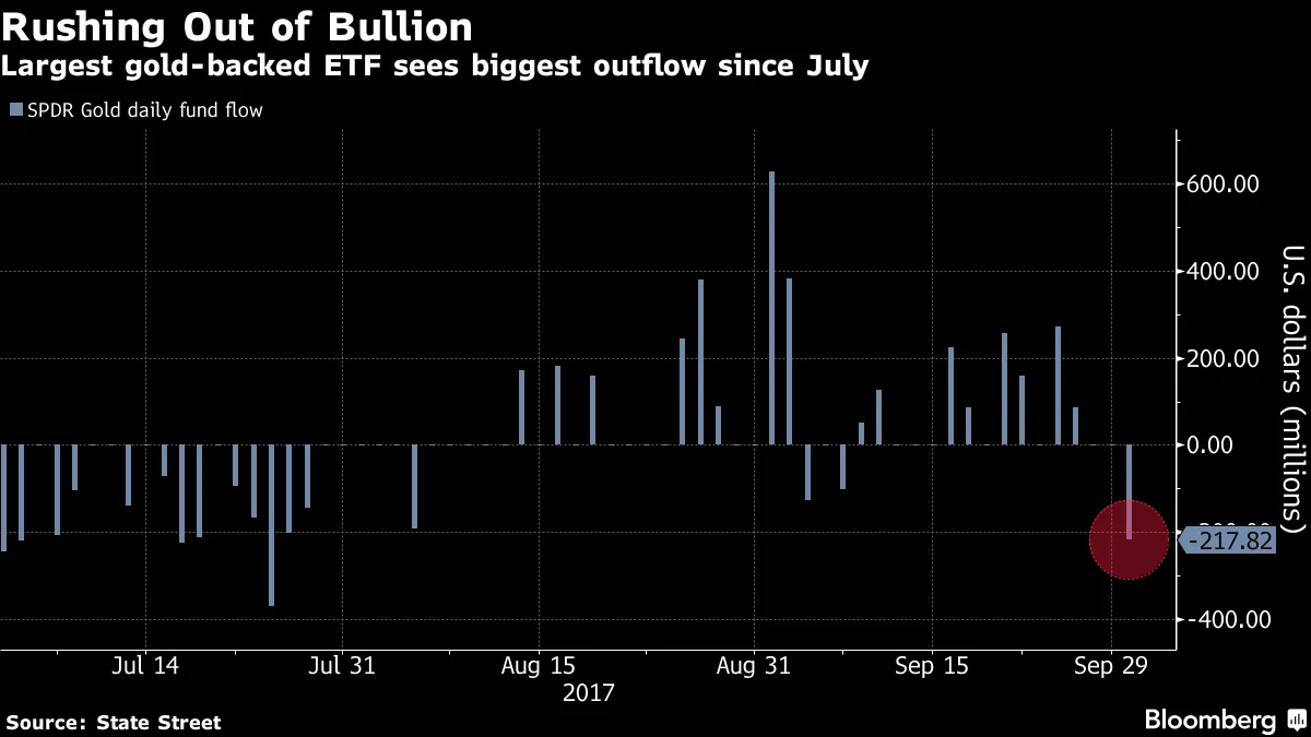 黄金快速下跌黄金投资者可能对美国与北韩之间的口水战变得麻木。周一,在特朗普表示国务卿雷克斯·蒂勒森“试图与北韩就其核武器进行谈判是在浪费时间”的一天后,SPDR黄金股票交易所交易基金的持有者在两个月多以来撤回了最多资金,彭博新闻的Luzi Ann Javier报道。黄金在9月初达到一年内最高点超过1360美元后,已下跌超过6%,至每盎司1274.60美元。此外,市场对美联储将在年底前提高利率的预期也对黄金施加了压力。对冲基金以两个月多以来最快的速度退出黄金期货和期权。在截至9月26日的一周内,资金经理将其净多头头寸,即对价格上涨的押注与对价格下跌的押注之间的差额,减少了16%,为7月11日以来的最大降幅。摩根大通分析师建议在12月黄金期货上保持空头,并“继续警惕在全球利率正常化周期中持有黄金作为政治对冲的风险。”