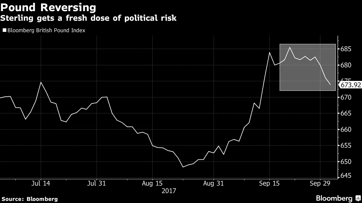 英镑下跌随着英格兰银行政策制定者对加息前景的乐观情绪在九月大部分时间内迅速建立,这种乐观情绪正迅速消退。在8月23日至9月21日期间上涨了5.74%后,彭博英镑指数自那时以来下跌了1.69%。虽然部分疲软可以归因于美元的反弹,但英国的经济数据也确实没有如预期般强劲。周二,IHS Markit的英国建筑活动指标在九月降至48.1,低于经济学家预测的51.1的中位数。自2016年8月以来,该指数首次低于50这一关键水平,表明经济增长与收缩的分界线。此外,政府越来越担心如果贸易协议不能尽快达成,可能会无协议脱离欧盟。根据彭博新闻的Tim Ross的说法,无协议离开欧盟将对商业造成灾难性影响,使金融市场、航空旅行和制药等行业陷入法律困境。