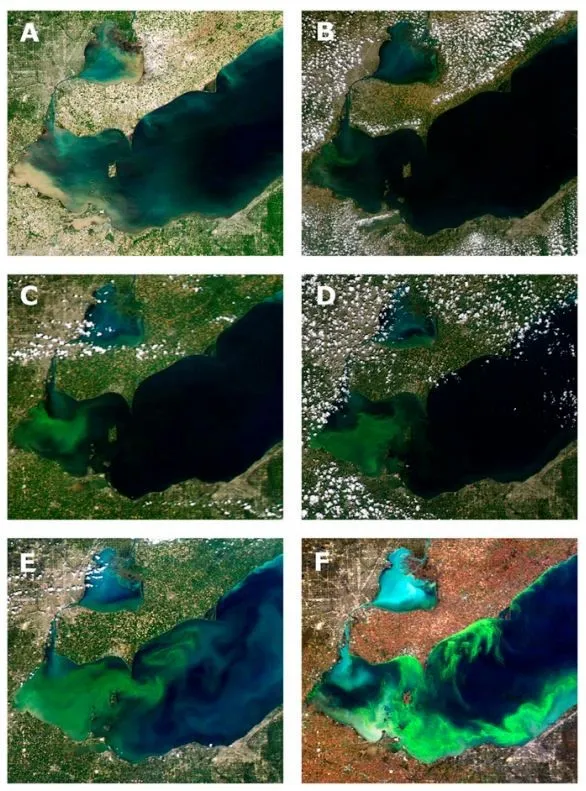 有证据表明,气候变化正在助长这里和世界各地麻烦藻类的复苏。变暖的气候能容纳更多的水分,并带来更强烈的降雨事件,这反过来又将更多的营养物质推入湖泊和沿海水域。你可以在这些2011年藻类暴发的卫星图像中看到伊利湖的绿色条纹在暴风雨后的演变,显示出从洪水泛滥的莫米河(左中部)流入伊利湖的沉积物,助长了有毒藻类的扩散。