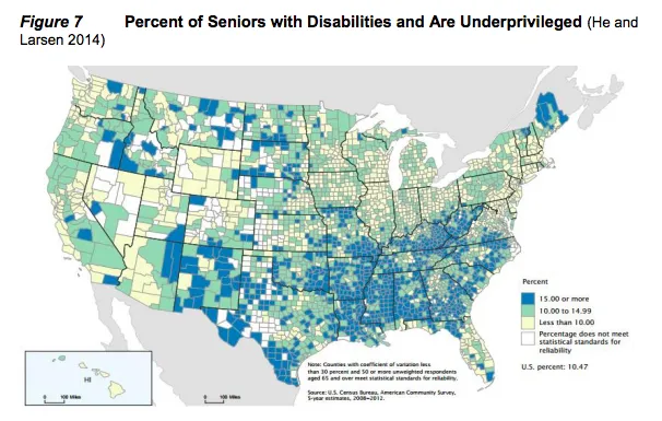 小城镇的退伍军人比例也更高:大约30%的退伍军人事务部健康管理系统的登记者生活在农村地区,其中44%的退伍军人至少有一种与服役相关的健康状况——这些状况可能会妨碍他们的驾驶能力。作为一个群体,残疾人士的公共交通出行次数比没有残疾的人多出约50%。