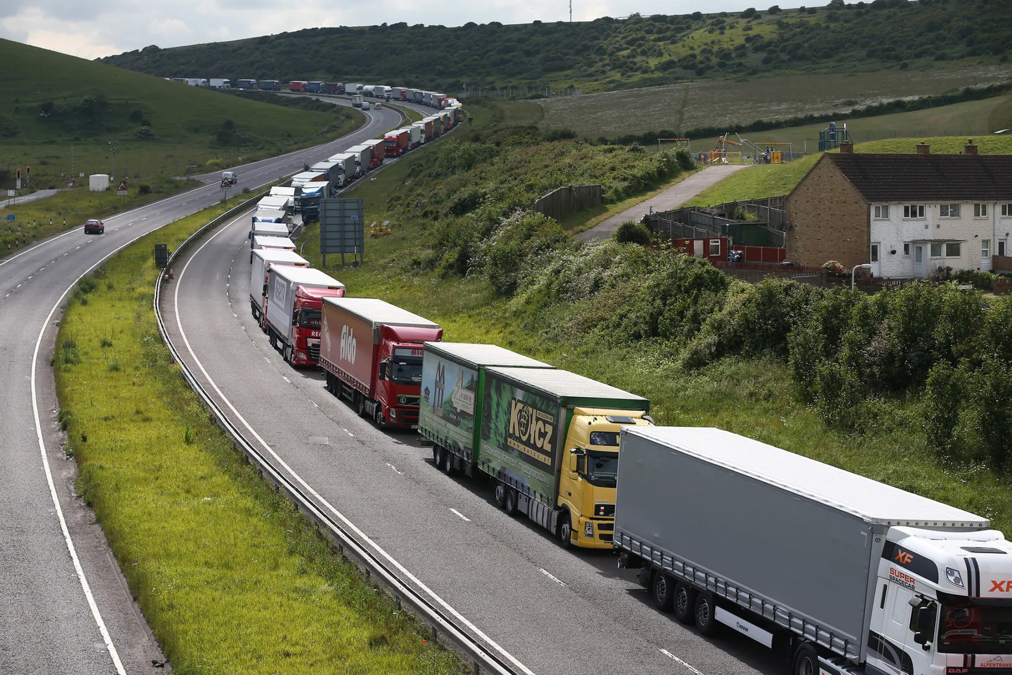 港口是一片错综复杂的道路,穿过停车区和安检,连接M-20高速公路与渡轮码头。经过的卡车牌照来自28个国家贸易区的各个角落。欧盟货物有一个简化的设施,而另一个部分则对来自共同市场以外的进口进行海关检查,这一过程每辆车可能需要5分钟到45分钟不等。如果要重新调整操作,使所有货物都经过非欧盟处理,将需要几个月甚至几年的规划。英国税务和海关机构的负责人在上个月的议会委员会听证会上称多佛的海关检查是一个“重大关切”。