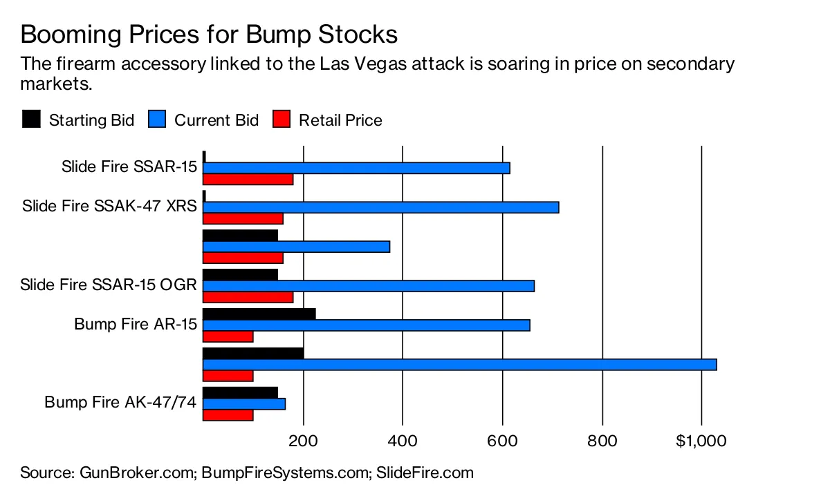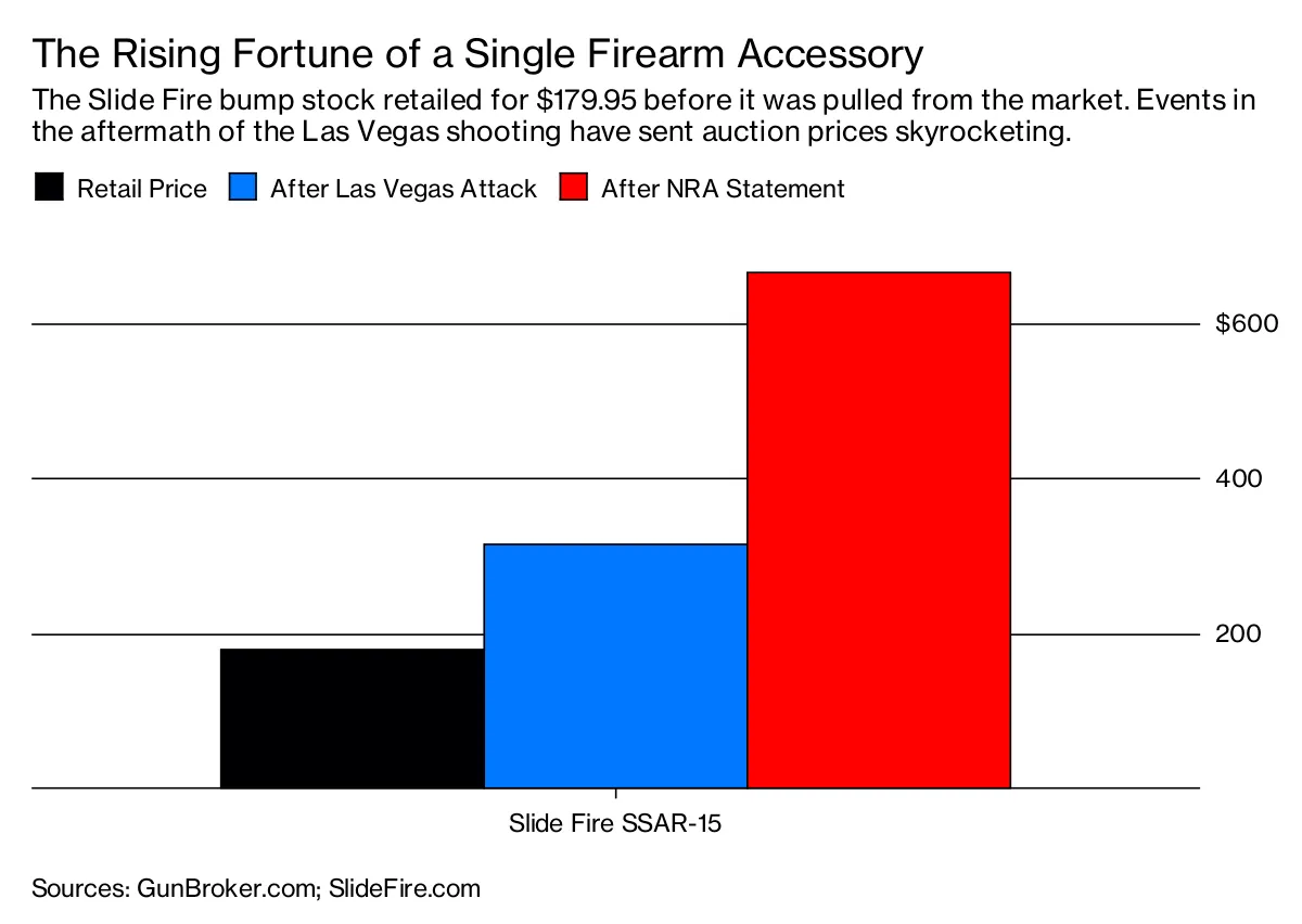 自拉斯维加斯大屠杀以来,撞火枪托的价格飙升。一个通常零售价格为179.95美元的Slide Fire SSAR-15 OGR枪托,在二手枪市场上被竞标至315美元 GunBroker.com。在全国步枪协会(NRA)于10月5日的 声明后,价格 飙升 至666美元。(由于订单过多,Slide Fire宣布暂停所有新销售。)