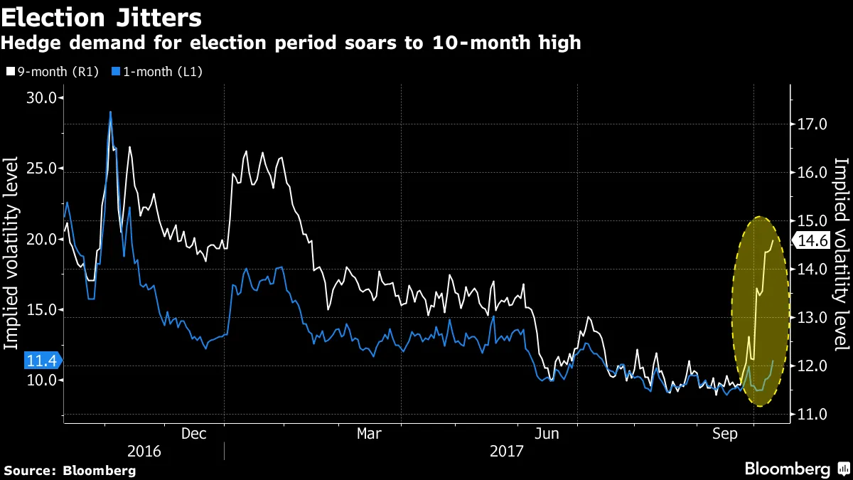 墨西哥比索再次承压今年货币市场的一个大新闻是墨西哥比索的意外反弹。回想一下,当特朗普当选美国总统时,这种货币在2016年底暴跌,随后在1月底的就职典礼后开始了一轮长时间的反弹。美元走弱以及意识到特朗普政府的保护主义政策并不容易实施吸引了交易者重新投资比索。但比索在上半年表现最佳,然而自9月中旬以来却成为全球表现最差的货币之一,因为重新谈判北美自由贸易协定的谈判拖延,而美国和墨西哥威胁退出该协议。与此同时,政治发展正在帮助巩固民粹主义候选人安德烈斯·曼努埃尔·洛佩斯·奥夫拉多尔在2018年7月总统选举前的领先地位,这让投资者感到担忧,他们认为他对国家经济构成威胁,根据彭博新闻的阿琳·小山和达尼埃拉·古兹曼的报道。比索隐含波动性飙升,因对冲损失的成本增加。预计价格波动最大的跳升出现在九个月的合约中——这些合约正好在墨西哥人投票选出下一任总统的时间到期。