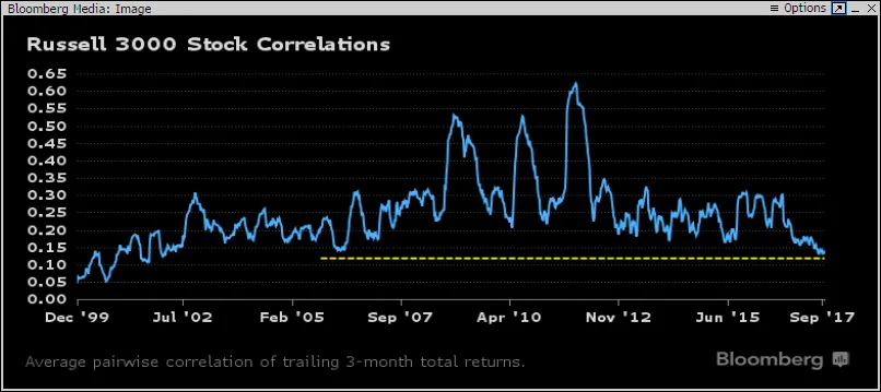 在熊市者对美国股票的厌恶中,许多论点之一是赢家和输家的差异非常小。是的,今年确实有显著的领头羊(想想科技股)和滞后者。但总体而言,这是一种上涨潮水提升所有船只的情况,使得被动投资者如指数和交易所交易基金受益,而股票挑选者则受到损害。熊市者声称,这无疑是市场即将修正的迹象。对他们来说,问题在于各种股票和行业之间的相关性开始下降,而市场仍然继续上涨,这显然是一个看涨的发展。根据DataTrek的策略师,标准普尔500指数与科技以外的10个市场行业之间的相关性已降至37%,这是十年来的最低点。对DataTrek来说,这意味着市场已经回归到一个更健康的“股票市场”,而不仅仅是“股市”。