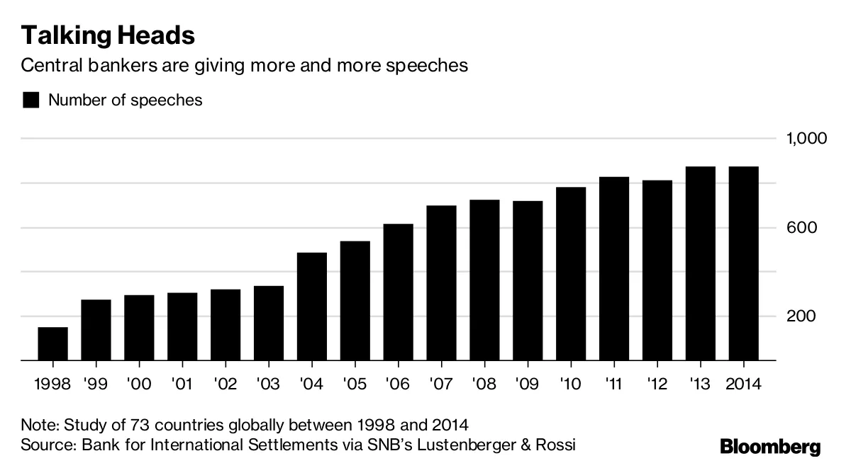 **谈到中央银行沟通……**也许如果中央银行不那么开放和透明会更好。两位瑞士国家银行的经济学家,托马斯·卢斯滕伯格和恩佐·罗西,在一篇新论文中指出,多年来中央银行沟通的增加“造成了混乱而非清晰”,并且没有帮助投资者和学者改善他们的宏观经济预测。根据彭博新闻的凯瑟琳·博斯利的说法,这反驳了透明度有助于中央银行减少市场波动性并实现其政策目标的观点。金融危机带来了一个新的共识,即向投资者提供前瞻性指引以引导对利率的预期将帮助官员们应对一代人中最严重的衰退。然而,这些经济学家表示,来自73个国家的数据“警告我们不应对更大的透明度和增强的沟通抱有过高的期望”。在研究的经济体中,从1998年到2014年,演讲数量几乎增加了六倍,但卢斯滕伯格和罗西发现“几乎没有证据”表明增加的沟通改善了预测的准确性。他们发现,虽然在2014年有20个机构处于最佳开放程度,23个低于标准,但有30个中央银行过于透明。