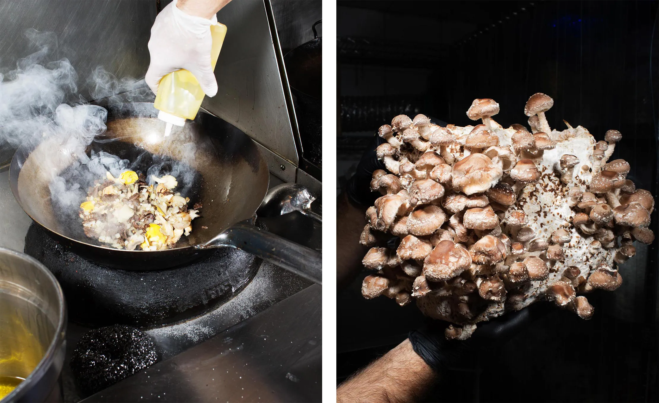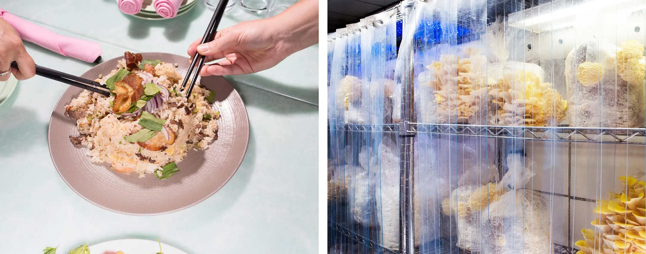 由Smallhold设计和建造的这个“迷你农场”已经筹备了几个月。如果一切按计划进行,蓝色、黄色和粉色的牡蛎菇、帝王菇和皮奥皮诺蘑菇将取代迪马尤加的牛肉干炒饭中的榉菇、口蘑和金针菇。迪马尤加兴奋地笑了。“刚采摘的蘑菇味道最好。”