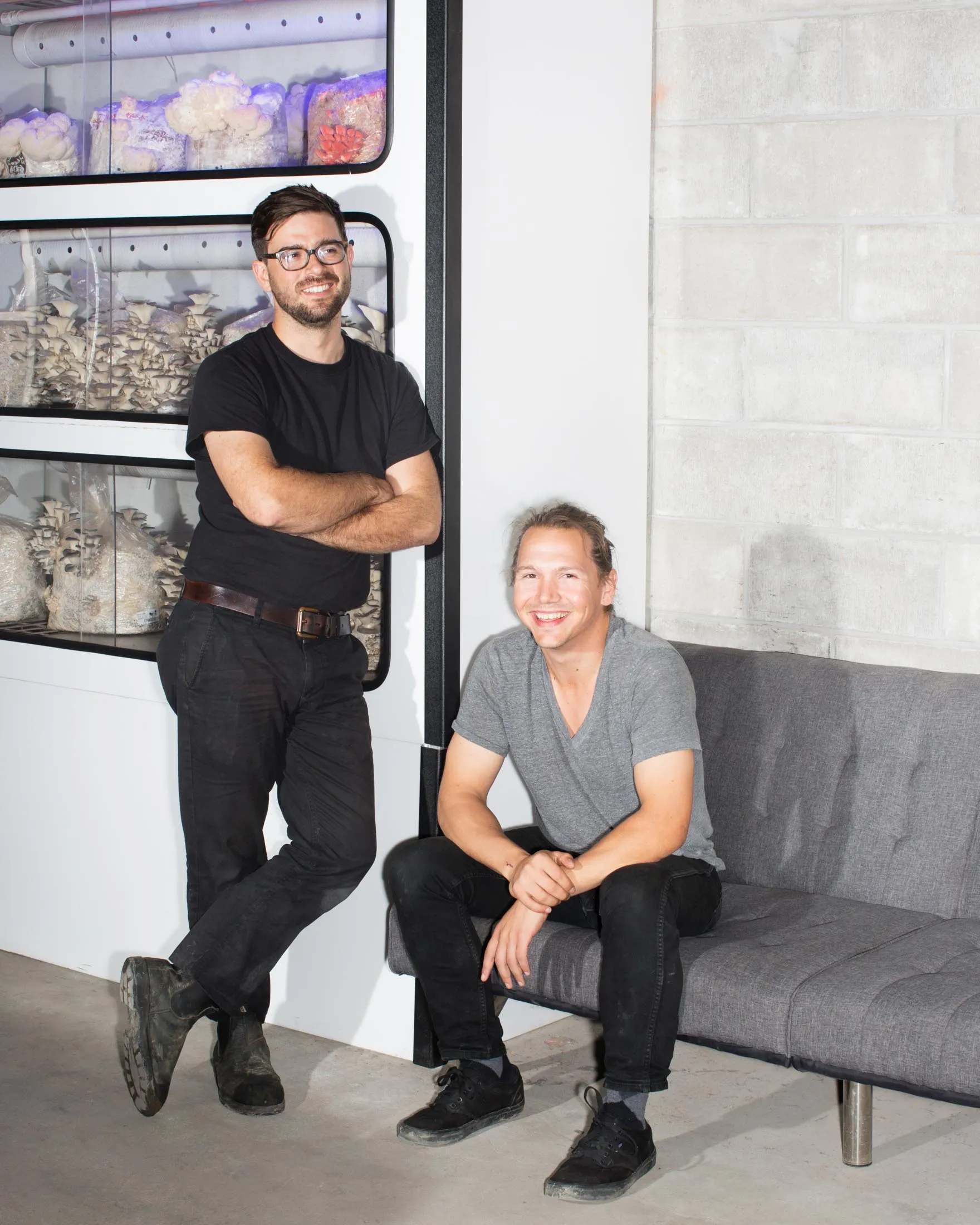 首席执行官安德鲁·卡特(左)和首席运营官亚当·德马蒂诺,Smallhold的联合创始人,在他们的仓库里。该初创公司为包括纽约的使命中餐厅在内的客户建造自动化气候控制的迷你农场。