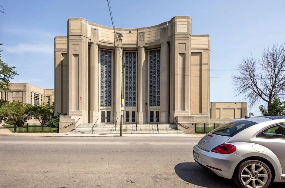 芝加哥职业高中(1941年),位于东87街2100号。李·贝南区的公共形象被视为一堵单一的黑色贫困墙。通过给这些建筑杂志封面的处理,贝希望观众意识到他们可能预期看到的衰败并不总是存在,并意识到南区的建筑能够承担起自己的责任。他的摄影方法“想要深入你的脑海,去除[种族主义和阶级主义],并希望你看到我在这样做,”贝说,他最近被杜萨布尔聘为规划、教育和博物馆体验的副总裁。