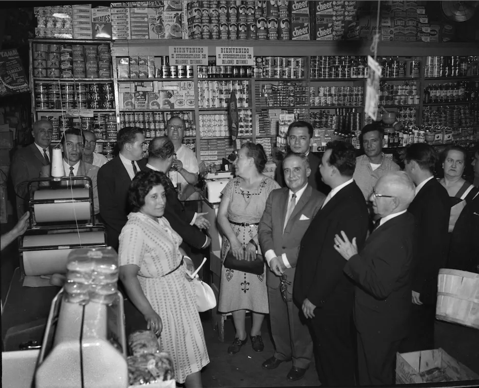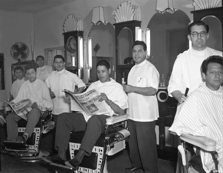 摄影:阿达尔贝托·巴里奥斯(1924-1976):费尔南多·埃斯特雷拉(中)在他的理发店,约1957年奥雷利奥·巴里奥斯街头小贩、教堂服务、理发店和当地印刷厂的照片描绘了移民社区的共同轨迹。首先是社会基础设施的基本单位,如教堂,然后是商店和企业等商业利益。最后,还有需要与多数人管理的行政国家合作的公民机构。