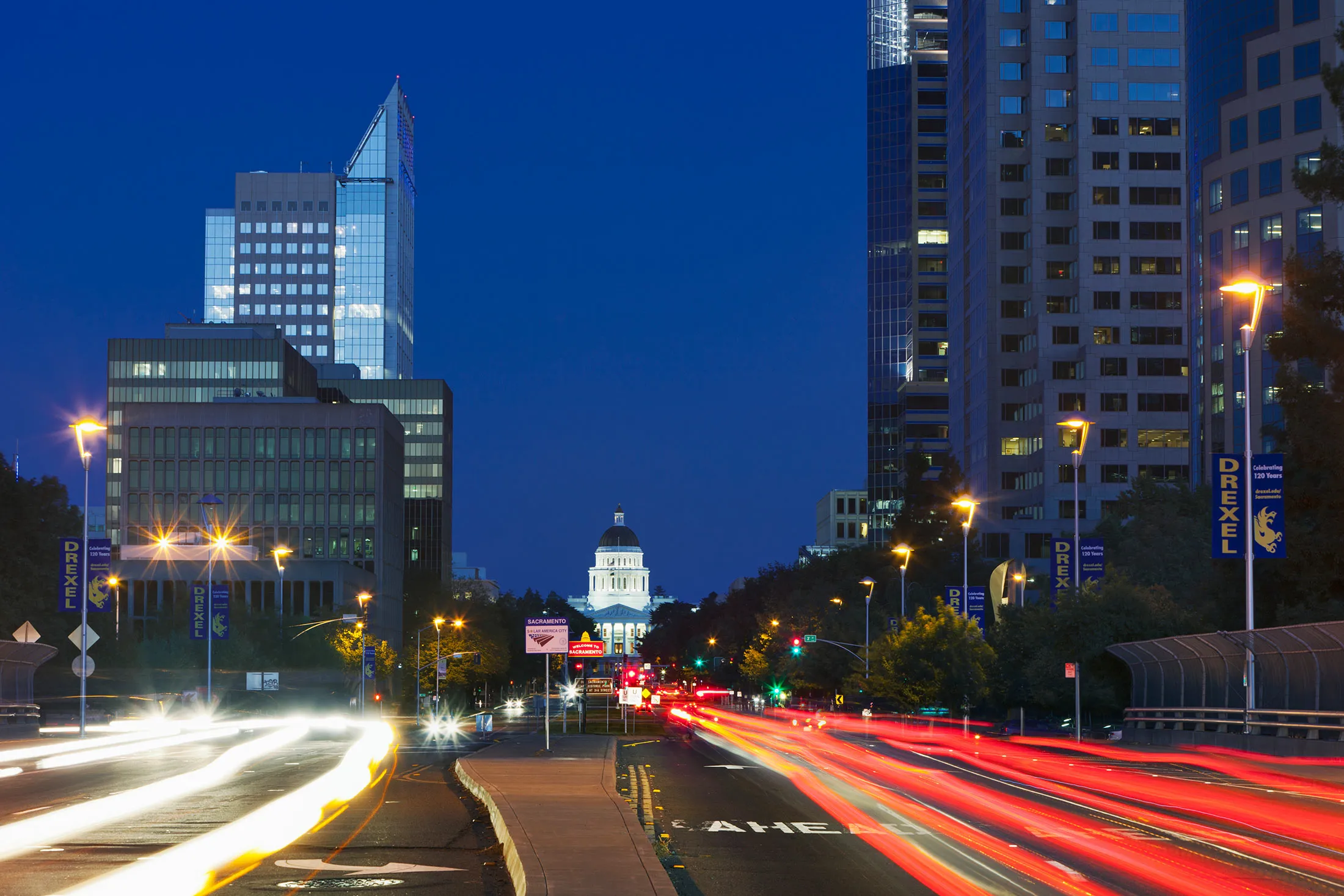 加州萨克拉门托的国会大厦广场在黄昏时分。