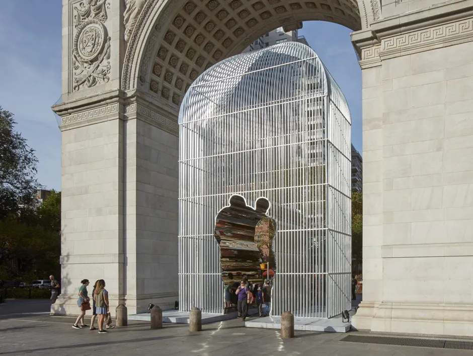 “圆形围栏。”蒂莫西·申克许多作品安装在历史上曾是移民家园的社区,如曼哈顿的下东区和皇后区的科罗娜公园,这是城市中种族最为多样化的地区之一。在中央公园,“镀金鸟笼”是一系列旋转门,唤起难民的身体限制。华盛顿广场公园的“拱门”使游客能够在双金属雕像的拥抱中看到自己的倒影,将“安全围栏”的概念转变为团结的象征。“圆形围栏”通过在法拉盛草原的全球地球仪周围创建一个由网状材料和金属障碍物构成的低围栏,强调了其象征意义。
