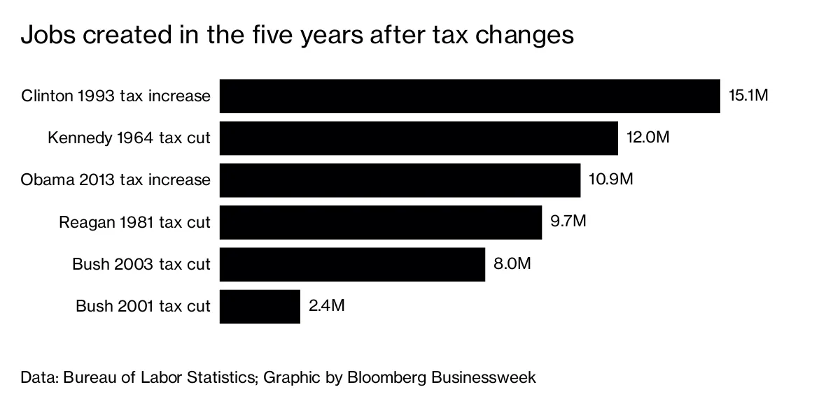 **“提案框架中的减税措施鼓励了创造就业所需的投资。……在布什总统2003年的减税后,经济在五年内创造了780万个就业机会。”**减税与就业增长之间没有明确的联系。在克林顿总统90年代增税后,就业增长飙升。2013年,奥巴马总统与参议院共和党人达成的增税方案后,就业也有所增长。
