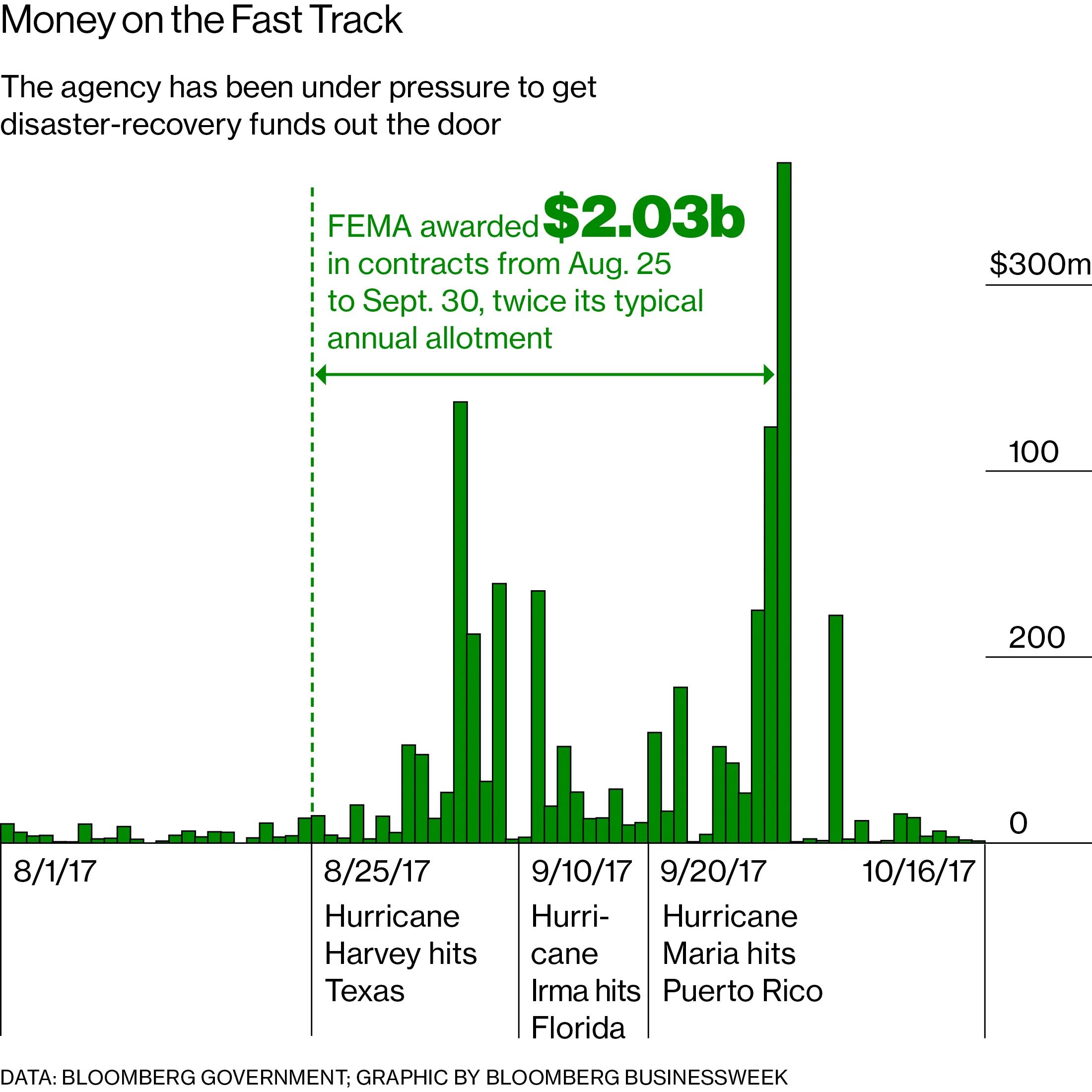 摄影师:乔斯林·奥古斯蒂诺/FEMA今年的创纪录飓风季节导致政府灾难合同的激增,创下十多年来的最高水平,考验着政府应对不可预测和不断增长的气候变化成本的能力。自从哈维飓风于8月25日袭击德克萨斯州以来,联邦应急管理局已根据彭博政府汇编的数据授予了22亿美元的合同。这是该机构通常在整年内授予金额的两倍左右。