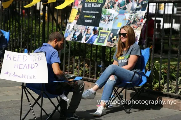 在纽约的Sidewalk Talk对话。由Sidewalk Talk提供在每个倾听站,两把椅子相对而坐。它可能看起来像一个DIY治疗办公室,但Sidewalk Talk并不是专业咨询的替代品。然而,所有章节领导者都经过心理健康专业人士的培训,能够识别精神危机的迹象。在需要时,这些领导者充当健康桥梁,将参与者与当地的经济实惠和低费用的治疗服务连接起来。自项目开始以来,他们已帮助约500人找到心理健康护理。参与者常常告诉志愿者,他们考虑过治疗,但太害怕联系任何人。在参加倾听活动后,许多人表示他们更愿意寻求专业帮助。
