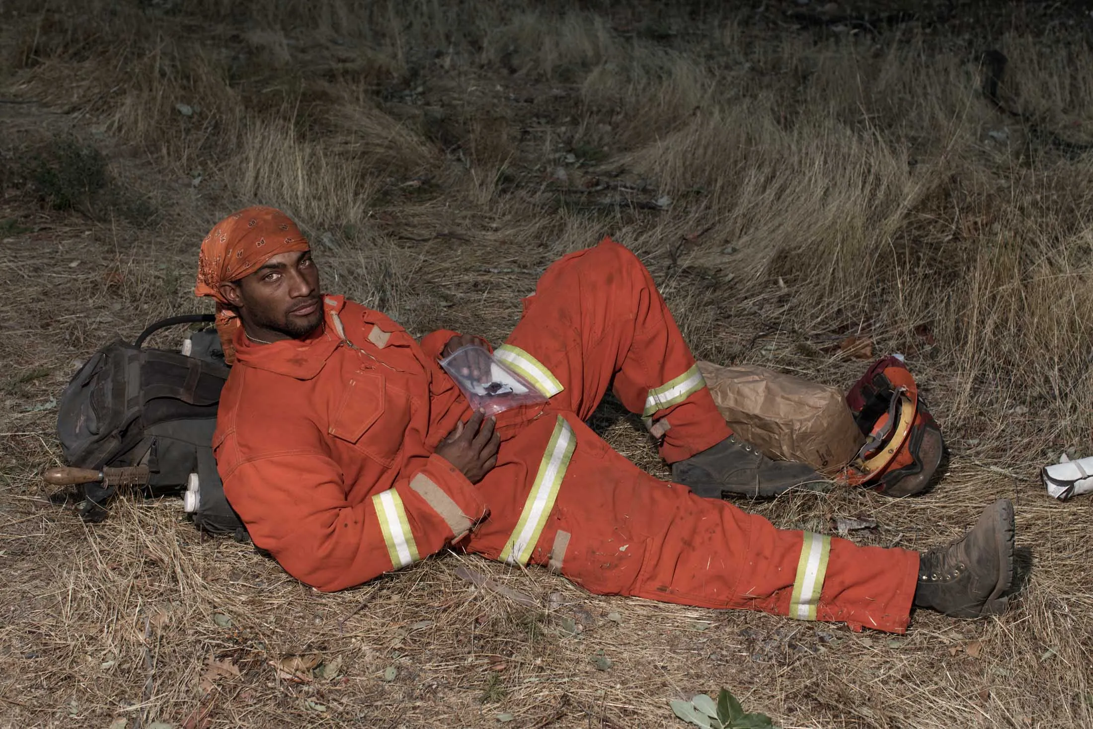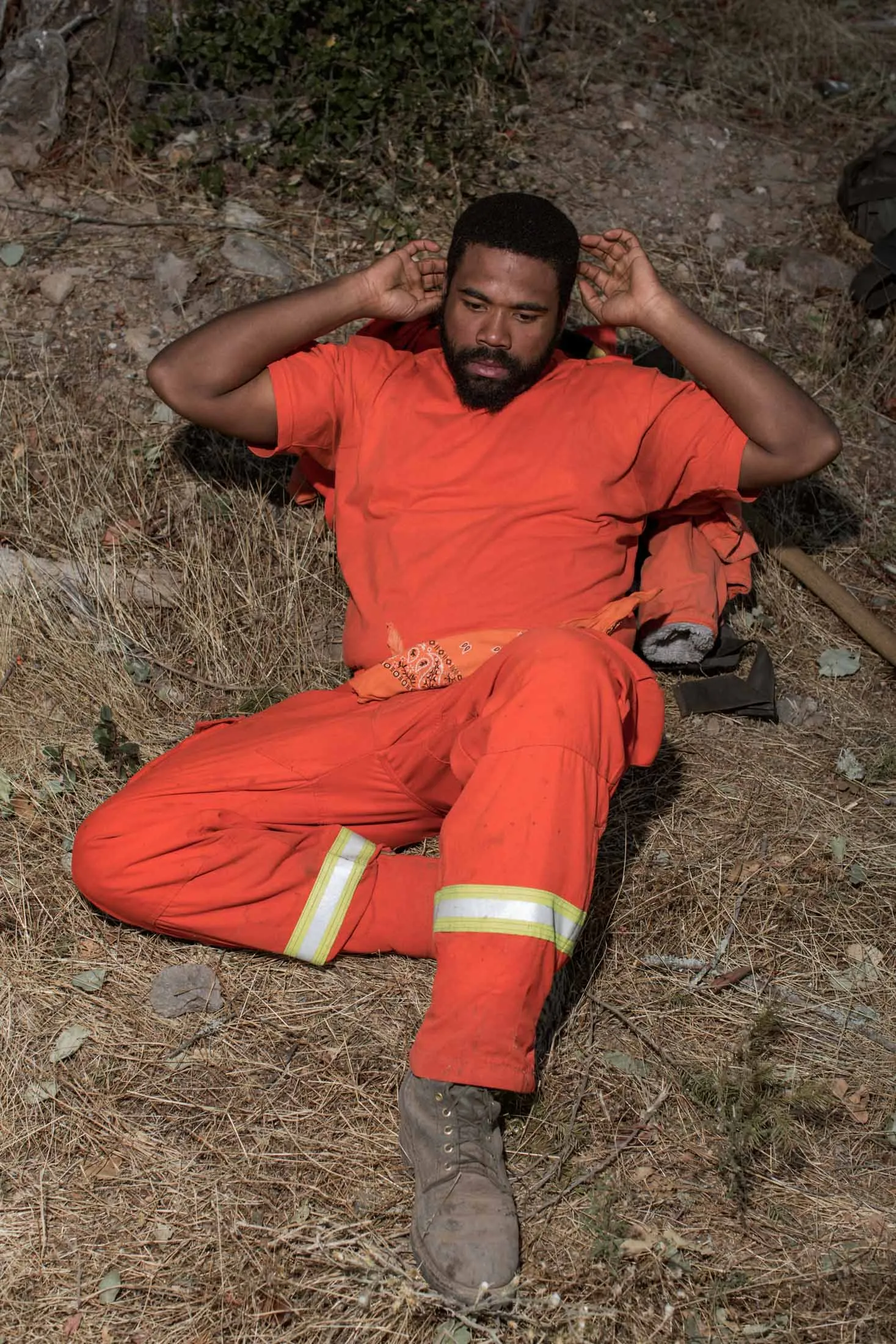 加州囚犯消防员 Rashaad Brooks 休息。摄影师:Philip Montgomery 为彭博商业周刊