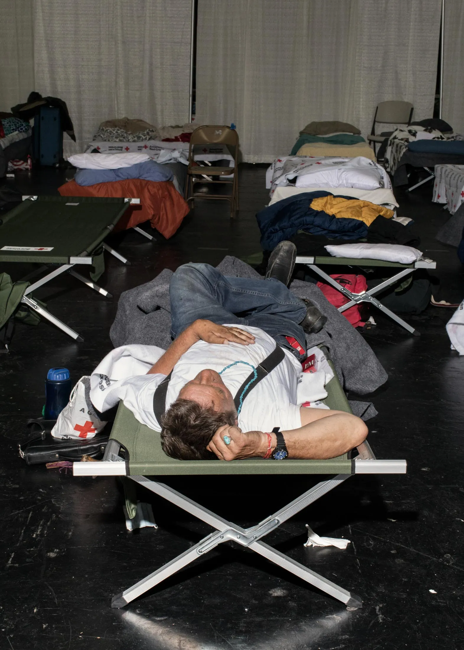 一位因北加州火灾而流离失所的居民在索诺玛县博览会场的避难所里睡在小床上。摄影师:Philip Montgomery 为彭博商业周刊