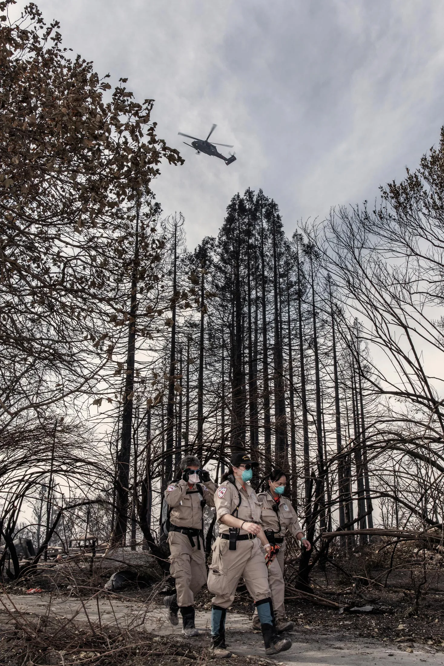 在直升机的掩护下,紧急救援队穿过科菲公园,这是北圣罗莎一个中产阶级住宅区,曾被图布斯火灾摧毁。摄影师:Philip Montgomery 为《彭博商业周刊》拍摄