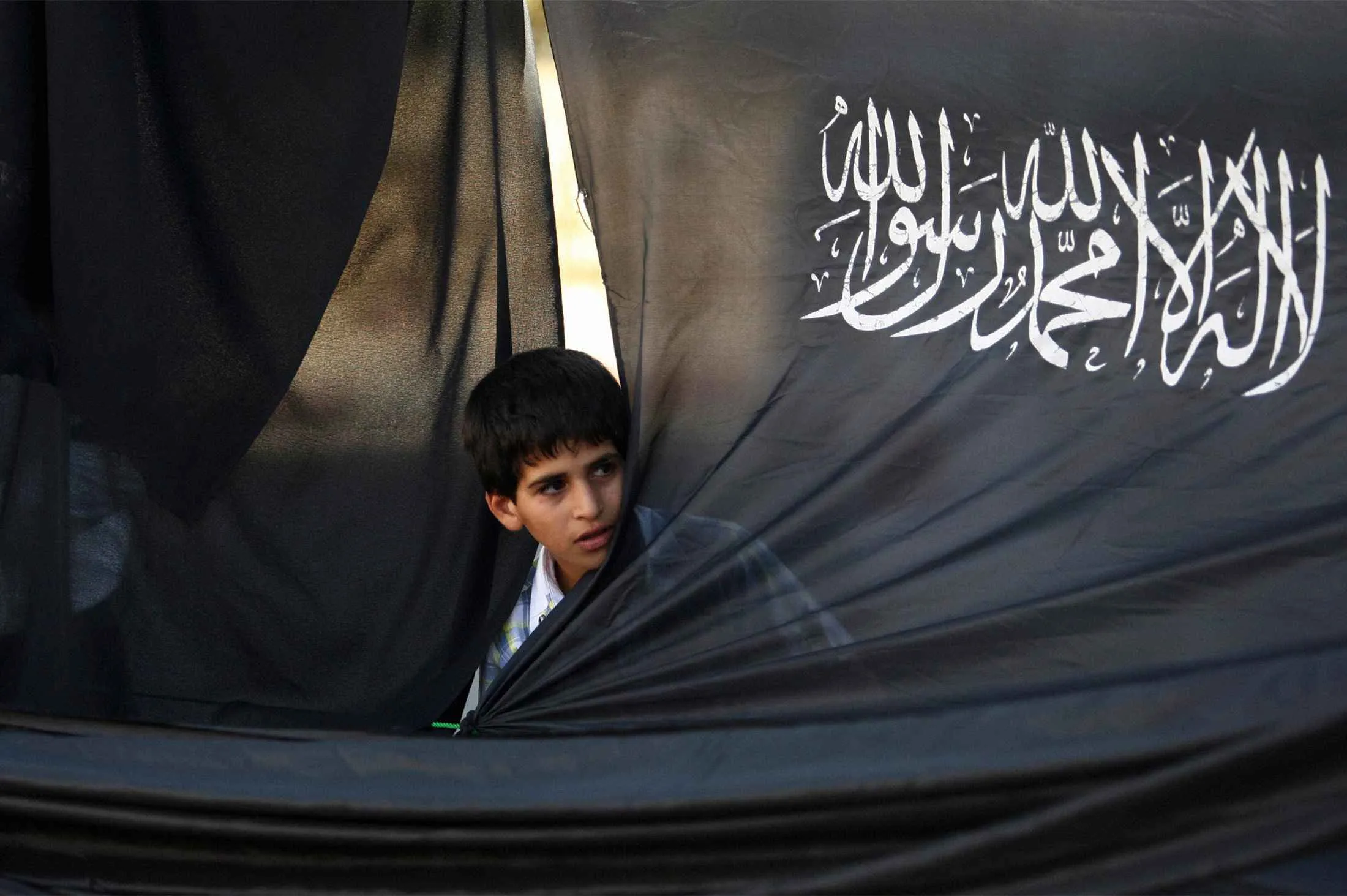 一个巴勒斯坦男孩在约旦河西岸城市拉马拉的集会上透过哈兹布·塔赫里尔(解放党)的旗帜观看。