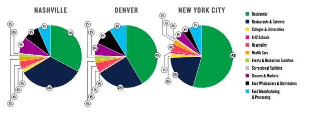 按部门划分的食物浪费比例NRDC研究人员将垃圾食品分为三类:通常可食用的、可疑可食用的(包括果皮和果核)和不可食用的(如果核、骨头和蛋壳)。然后,他们汇总了垃圾箱挖掘和厨房日记的发现,以评估每个城市的浪费情况。在丹佛和纽约,居民扔掉了大部分浪费的食物;在纳什维尔,住宅和餐饮部门势均力敌。