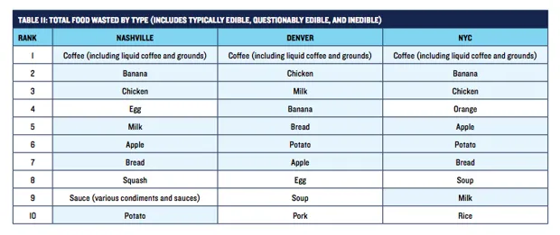 在这三个城市中,咖啡和咖啡渣是最常被丢弃的物品,其次是香蕉(在纳什维尔和纽约)和鸡肉(在丹佛)。苹果、面包、橙子和土豆也位列前茅,废弃的乳制品同样如此。
