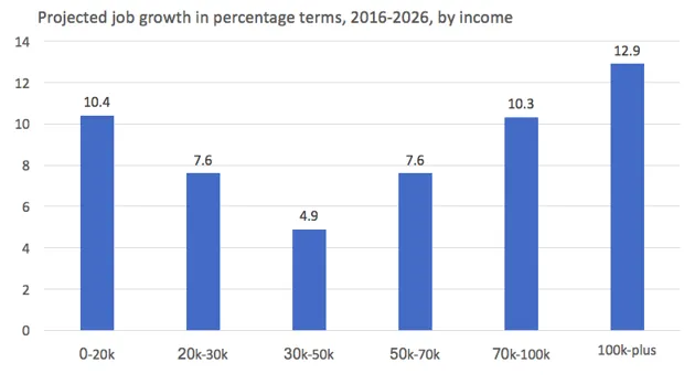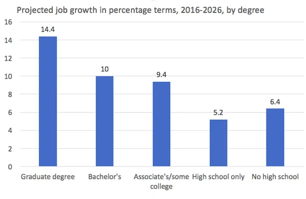 未来10年可能会加剧收入和地理上的不平等。拥有学士学位的人的工作岗位预计将以两倍于仅拥有高中学历的人的速度增长。