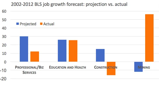 这引出了一个更大的问题:政府在预测未来方面是否可靠?美国劳工统计局(BLS)在世纪初对下一个十年的预测没有预见到大萧条,这限制了整体就业增长并摧毁了建筑业,或者天然气革命,这创造了采矿繁荣。另一方面,它准确预测了教育和医疗保健的增长,误差在一个百分点以内。