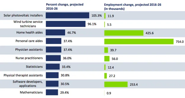 彭博社城市实验室阿根廷毒品贩运热点谋杀案激增在一个年轻人的城市,市长的标志性政策是学校午餐机器人出租车对公共交通没有好处繁荣的剑桥揭示了英格兰日益扩大的财富差距到2026年,增长最快的工作属于可以称之为“三个C”的领域:护理、计算机和清洁能源。预计没有哪个职业会增加比个人护理助手更多的工人,他们为老年美国人执行非医疗职责,如洗澡和做饭。与家庭健康助手一起,这两个职业预计将在下一个十年创造110万个新工作。值得注意的是,这占美国劳工统计局预计经济将增加的1150万个工作的10%。清洁能源工人,如太阳能面板安装工和风力涡轮机技术人员,是预计到2026年将翻倍的唯一职业。数学家和统计学家则位列前十名之中。