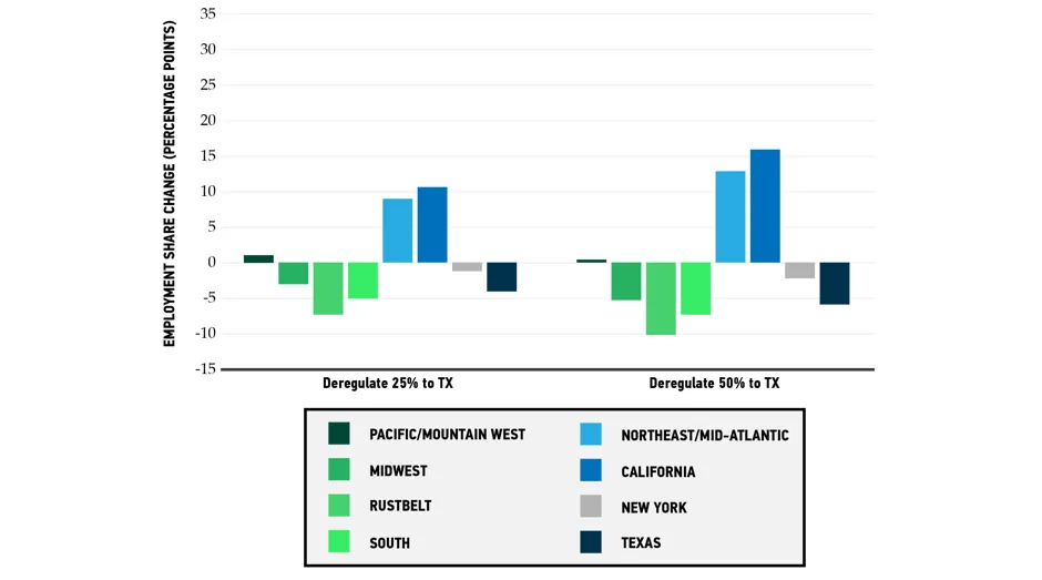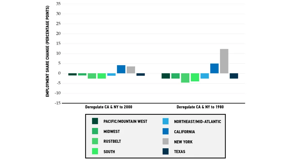 然而——这很重要——这样的放松管制将带来重大的地理后果。虽然这将使加利福尼亚州和纽约州的超级经济体,以及东北/中大西洋地区的经济体更加强大,但它也会使人和工作岗位从锈带流出,恶化这些州已经糟糕的经济状况。而且,它可能会使人和工作岗位从阳光带流出,同时削弱该地区已经在减少的经济活动。